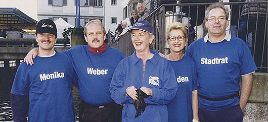 Der ZSS-Vorstand unterstützt die parteilose «Sportministerin» Monika Weber und nimmt mit einem Rudervierer an der Jubiläumsregatta des Akademischen Sportverbands Zürich teil. Das Boot mit Hermann Schumacher, Erich Ogi, Fränzi Rota und Daniel Gundelfinger gewannen ein Rennen gegen den Vorstand des ZKS.